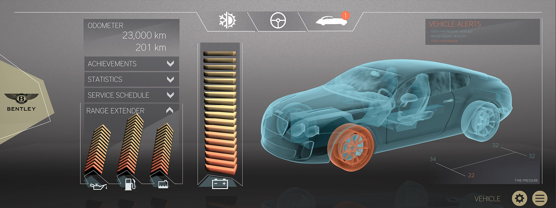 Information stack on left relays detailed information on request. Includes ‘Achievements’ tab that can supply incentives and enhance users ownership experience through goal setting and tracking