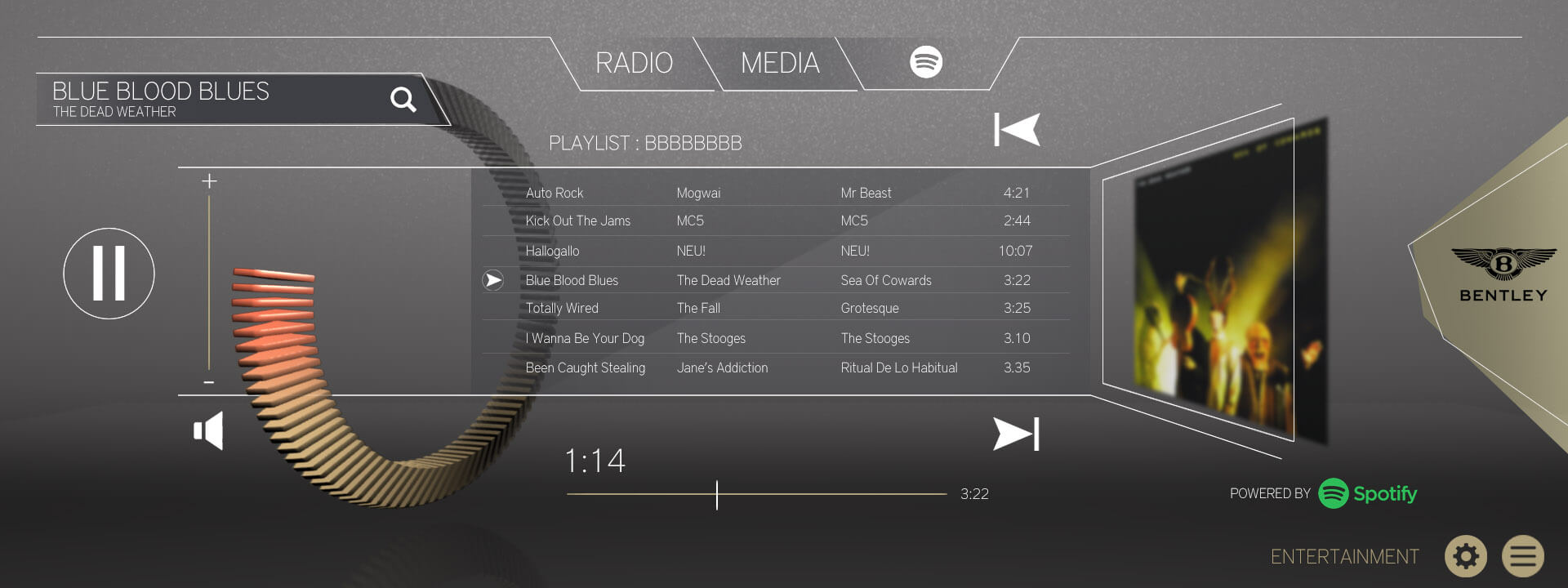 Entertainment screen, showing here a UI connected to a user’s digital music account